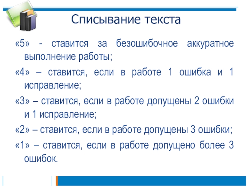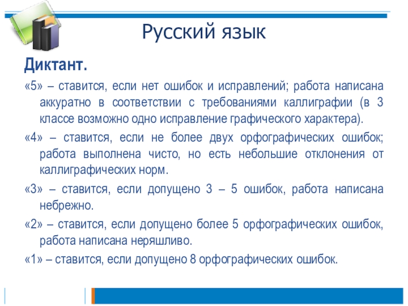 «4» – ставится, если не более двух орфографических ошибок; работа выполнена чисто, но есть небольшие отклонения от каллиграфических норм.