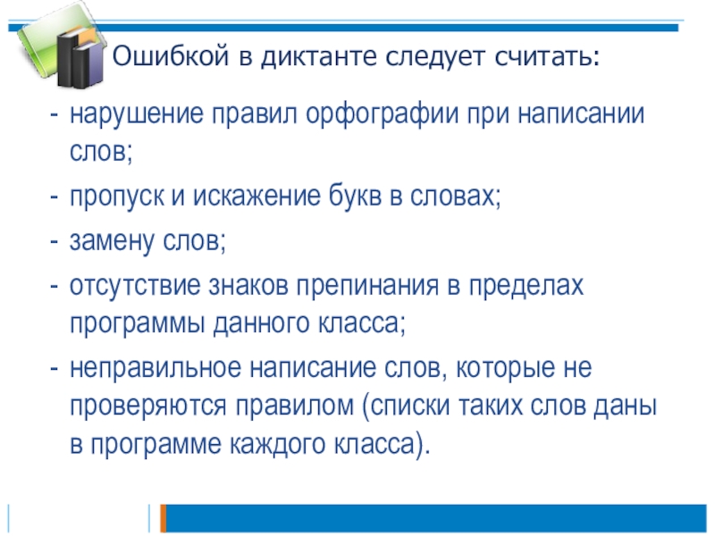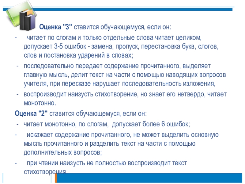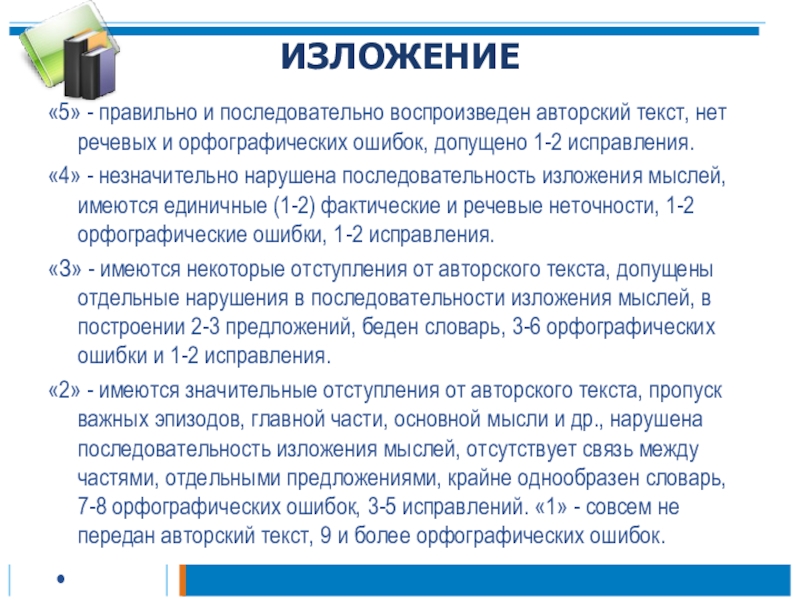 «2» - имеются значительные отступления от авторского текста, пропуск важных эпизодов, главной части, основной мысли и др., нарушена последовательность изложения мыслей, отсутствует связь между частями, отдельными предложениями, крайне однообразен словарь, 7-8 орфографических ошибок, 3-5 исправлений. «1» - совсем не передан авторский текст, 9 и более орфографических ошибок.