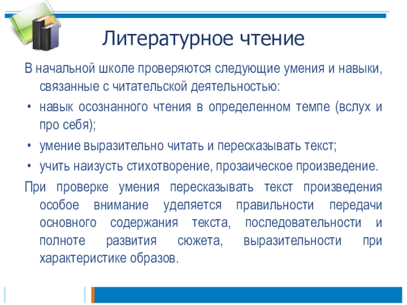 школьника: умение ориентироваться в книге, знание литературных произведений, их жанров и особенностей, знание имен детских писателей и поэтов и их жанровые приоритеты (писал сказки, стихи о природе и т.п.).