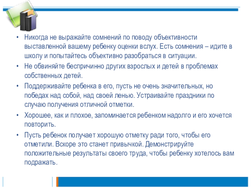 Поддерживайте ребенка в его, пусть не очень значительных, но победах над собой, над своей ленью. Устраивайте праздники по случаю получения отличной отметки.