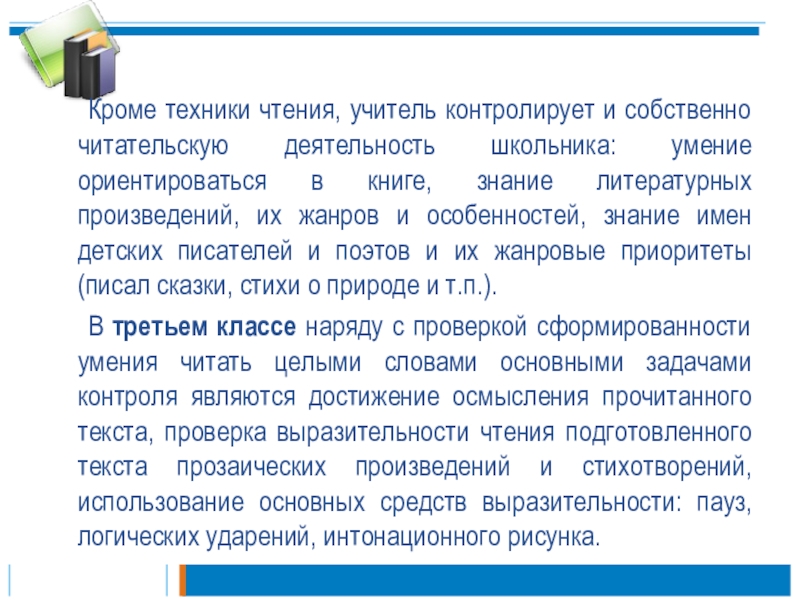 В третьем классе наряду с проверкой сформированности умения читать целыми словами основными задачами контроля являются достижение осмысления прочитанного текста, проверка выразительности чтения подготовленного текста прозаических произведений и стихотворений, использование основных средств выразительности: пауз, логических ударений, интонационного рисунка.