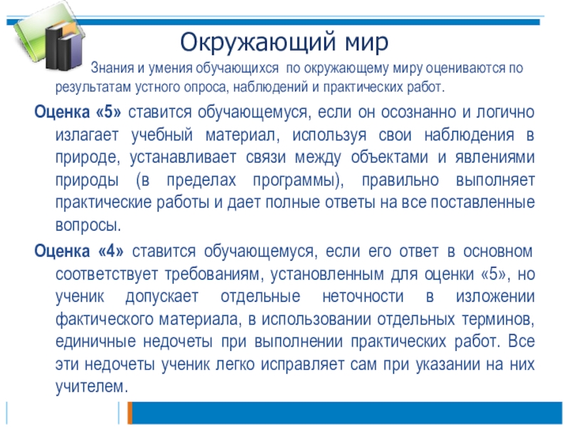 Знания и умения обучающихся по окружающему миру оцениваются по результатам
