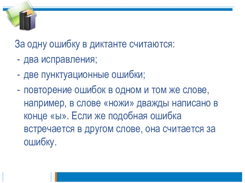 одном и том же слове, например, в слове «ножи» дважды написано в конце «ы». Если же подобная ошибка встречается в другом слове, она считается за ошибку.