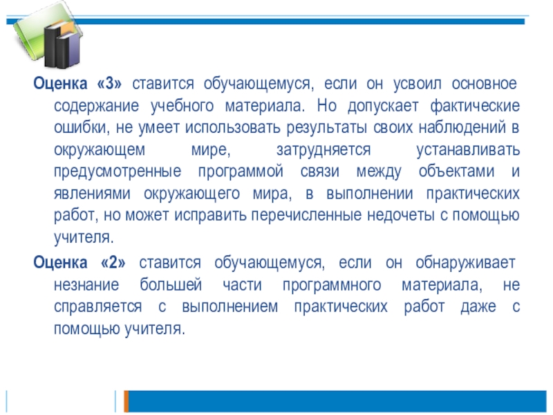 Но допускает фактические ошибки, не умеет использовать результаты своих наблюдений в окружающем мире, затрудняется устанавливать предусмотренные программой связи между объектами и явлениями окружающего мира, в выполнении практических работ, но может исправить перечисленные недочеты с помощью учителя.