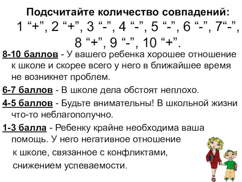 8-10 баллов - У вашего ребенка хорошее отношение к школе и скорее всего у него в ближайшее время не возникнет проблем.