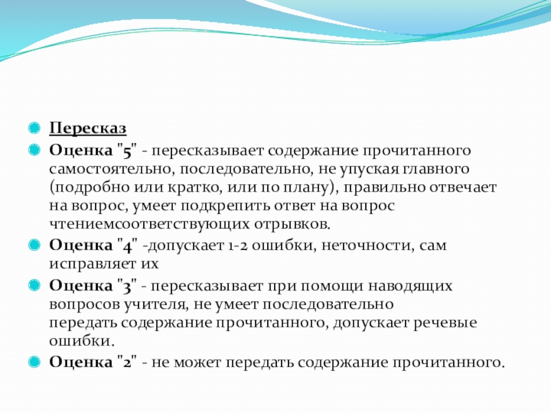 Оценка "5" - пересказывает содержание прочитанного самостоятельно, последовательно, не упуская главного (подробно
