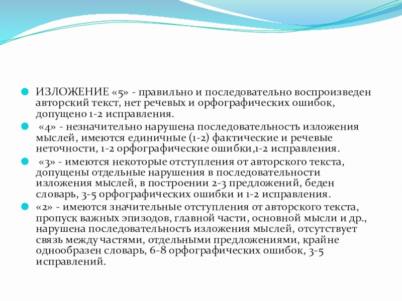 Слайд 13ИЗЛОЖЕНИЕ «5» - правильно и последовательно воспроизведен авторский текст, нет речевых