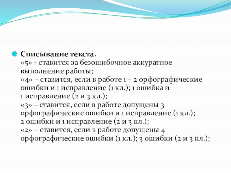 «2» – ставится, если в работе допущены 4 орфографические ошибки (1 кл.); 3 ошибки (2 и 3 кл.);