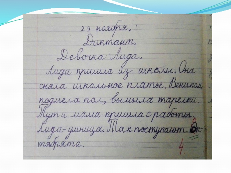 «4» – ставится, если не более двух орфографических ошибок; работа выполнена чисто, но есть небольшие отклонения от каллиграфических норм.