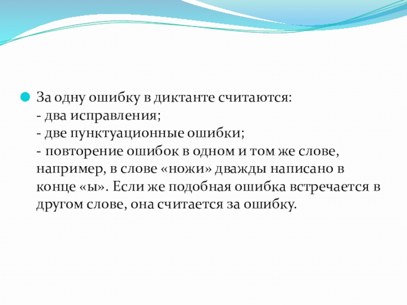 - повторение ошибок в одном и том же слове, например, в слове «ножи» дважды написано в конце «ы». Если же подобная ошибка встречается в другом слове, она считается за ошибку.