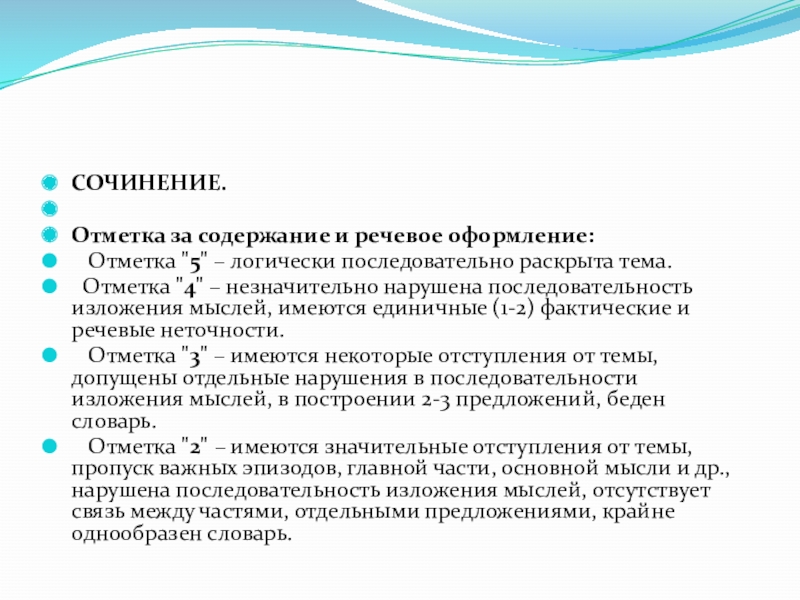 Отметка "3" – имеются некоторые отступления от темы, допущены отдельные нарушения в последовательности изложения мыслей, в построении 2-3 предложений, беден словарь.