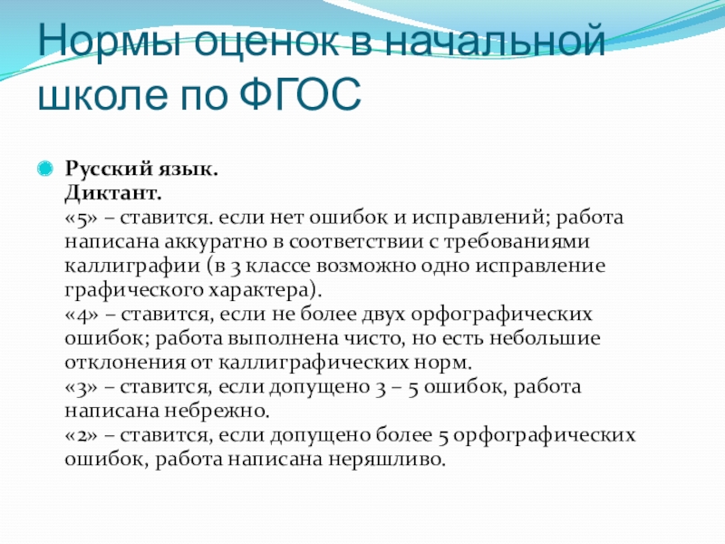 Слайд 24Нормы оценок в начальной школе в соответствии с ФГОС ОЦЕНКА ПИСЬМЕННЫХ