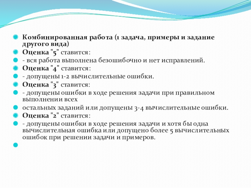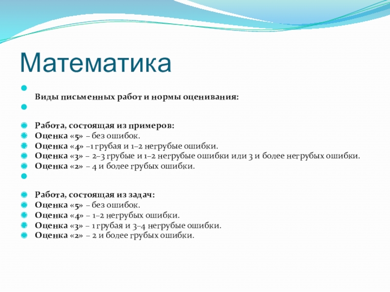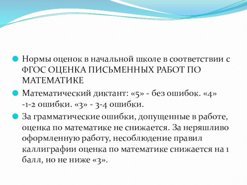 За грамматические ошибки, допущенные в работе, оценка по математике не снижается. За неряшливо оформленную работу, несоблюдение правил каллиграфии оценка по математике снижается на 1 балл, но не ниже «3».