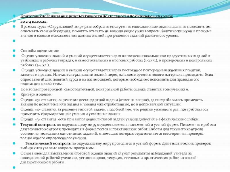 Текущий контроль по окружающему миру осуществляется в письменной и устной форме. Письменные работы для текущего контроля проводятся в форме тестов и практических работ. Работы для текущего контроля состоят из нескольких однотипных заданий, с помощью которых осуществляется всесторонняя проверка только одного определенного умения.