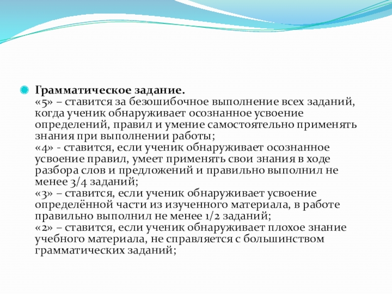 «4» - ставится, если ученик обнаруживает осознанное усвоение правил, умеет применять свои знания в ходе разбора слов и предложений и правильно выполнил не менее 3/4 заданий;