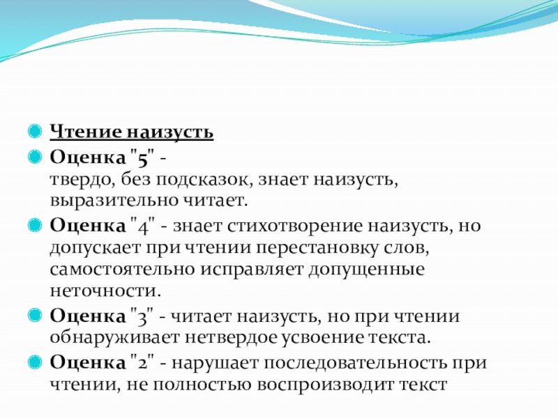 Оценка "3" - читает наизусть, но при чтении обнаруживает нетвердое усвоение текста.