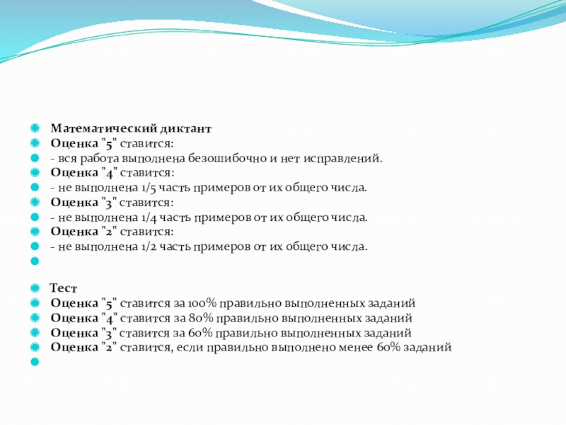 Математический диктант: «5» - без ошибок. «4» -1-2 ошибки. «3» - 3-4 ошибки.