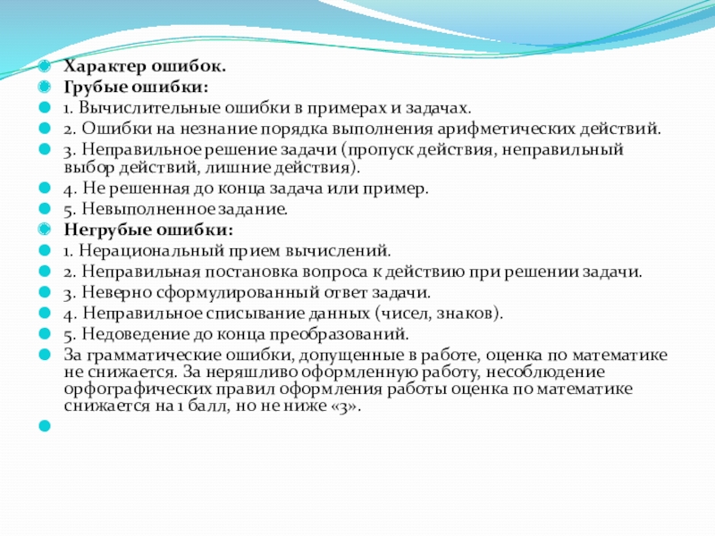 За грамматические ошибки, допущенные в работе, оценка по математике не снижается. За неряшливо оформленную работу, несоблюдение орфографических правил оформления работы оценка по математике снижается на 1 балл, но не ниже «3».