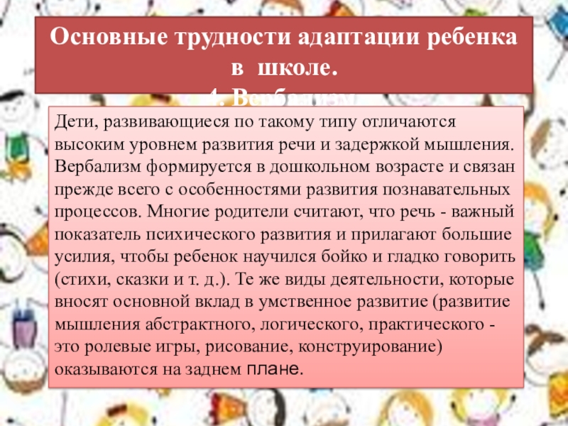типу отличаются высоким уровнем развития речи и задержкой мышления. Вербализм формируется в дошкольном возрасте и связан прежде всего с особенностями развития познавательных процессов. Многие родители считают, что речь - важный показатель психического развития и прилагают большие усилия, чтобы ребенок научился бойко и гладко говорить (стихи, сказки и т. д.). Те же виды деятельности, которые вносят основной вклад в умственное развитие (развитие мышления абстрактного, логического, практического - это ролевые игры, рисование, конструирование) оказываются на заднем плане.