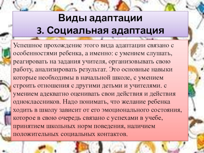 особенностями ребенка, а именно: с умением слушать, реагировать на задания учителя, организовывать свою работу, анализировать результат. Это основные навыки которые необходимы в начальной школе, с умением строить отношения с другими детьми и учителями. с умением адекватно оценивать свои действия и действия одноклассников. Надо понимать, что желание ребенка ходить в школу зависит от его эмоционального состояния, которое в свою очередь связано с успехами в учебе, принятием школьных норм поведения, наличием положительных социальных контактов.