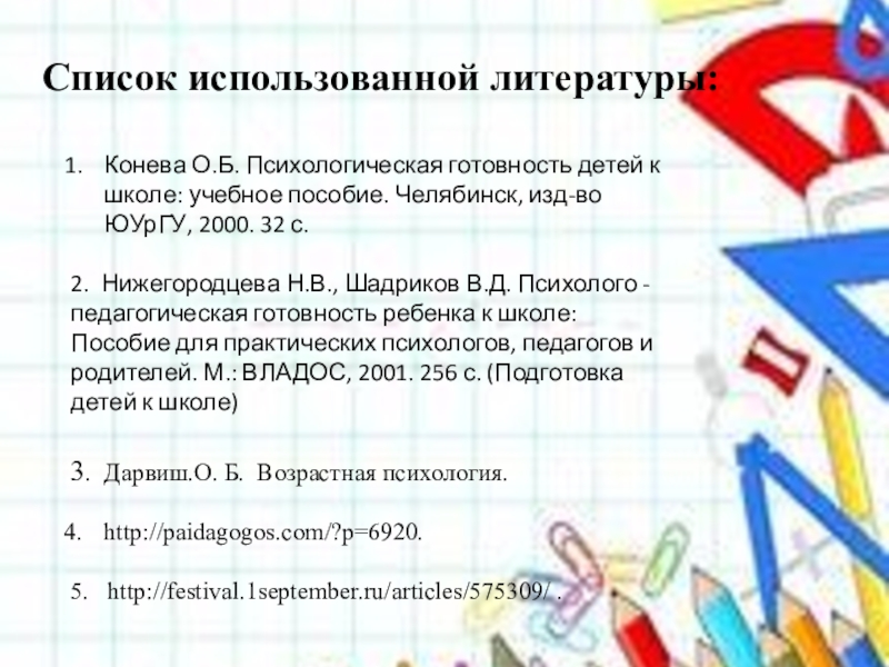 2. Нижегородцева Н.В., Шадриков В.Д. Психолого - педагогическая готовность ребенка к школе: Пособие для практических психологов, педагогов и родителей. М.: ВЛАДОС, 2001. 256 с. (Подготовка детей к школе)