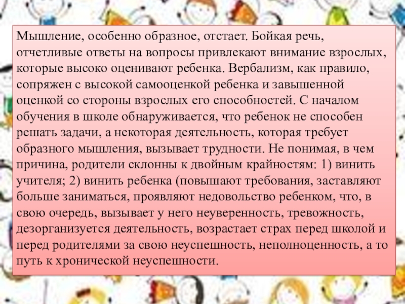 внимание взрослых, которые высоко оценивают ребенка. Вербализм, как правило, сопряжен с высокой самооценкой ребенка и завышенной оценкой со стороны взрослых его способностей. С началом обучения в школе обнаруживается, что ребенок не способен решать задачи, а некоторая деятельность, которая требует образного мышления, вызывает трудности. Не понимая, в чем причина, родители склонны к двойным крайностям: 1) винить учителя; 2) винить ребенка (повышают требования, заставляют больше заниматься, проявляют недовольство ребенком, что, в свою очередь, вызывает у него неуверенность, тревожность, дезорганизуется деятельность, возрастает страх перед школой и перед родителями за свою неуспешность, неполноценность, а то путь к хронической неуспешности.