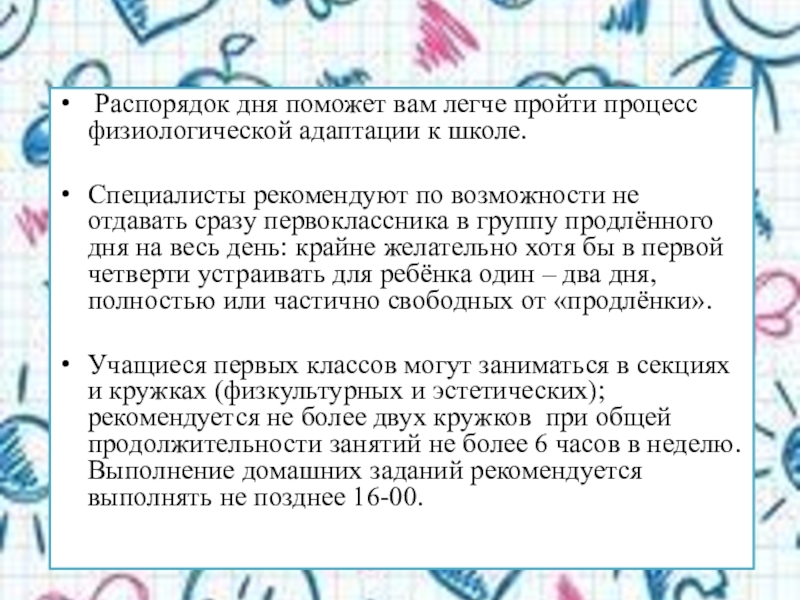 Учащиеся первых классов могут заниматься в секциях и кружках (физкультурных и эстетических); рекомендуется не более двух кружков при общей продолжительности занятий не более 6 часов в неделю. Выполнение домашних заданий рекомендуется выполнять не позднее 16-00.
