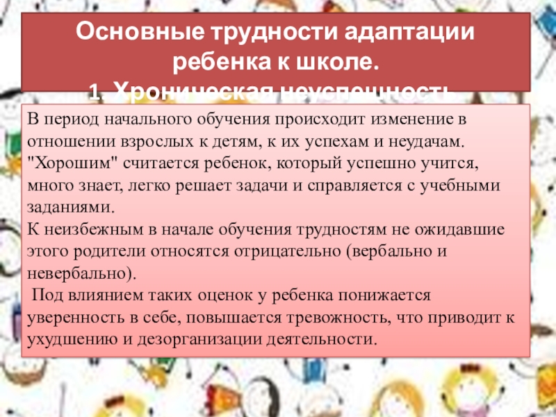 Слайд 17Основные трудности адаптации ребенка в школе.
