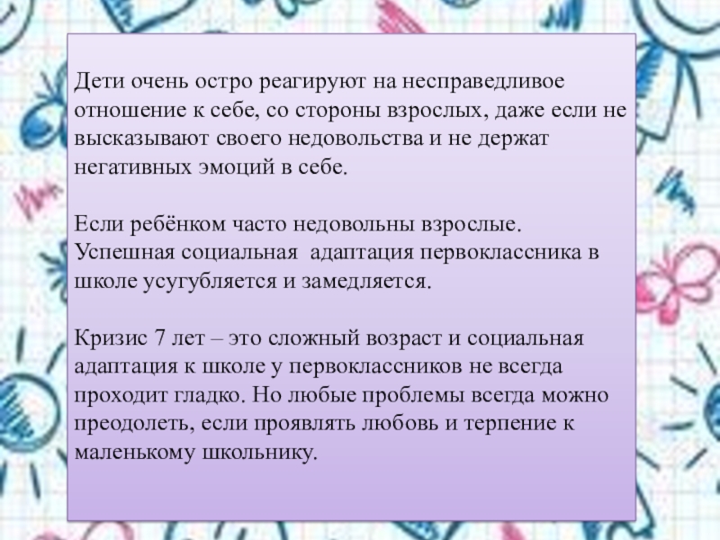 Кризис 7 лет – это сложный возраст и социальная адаптация к школе у первоклассников не всегда проходит гладко. Но любые проблемы всегда можно преодолеть, если проявлять любовь и терпение к маленькому школьнику.