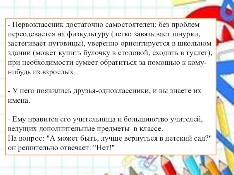 Слайд 35- Первоклассник достаточно самостоятелен: без проблем переодевается на физкультуру (легко завязывает