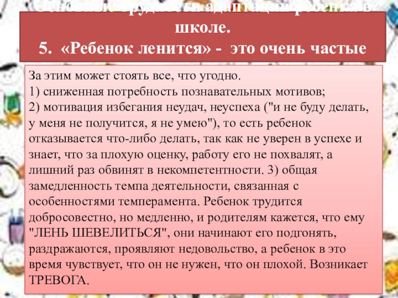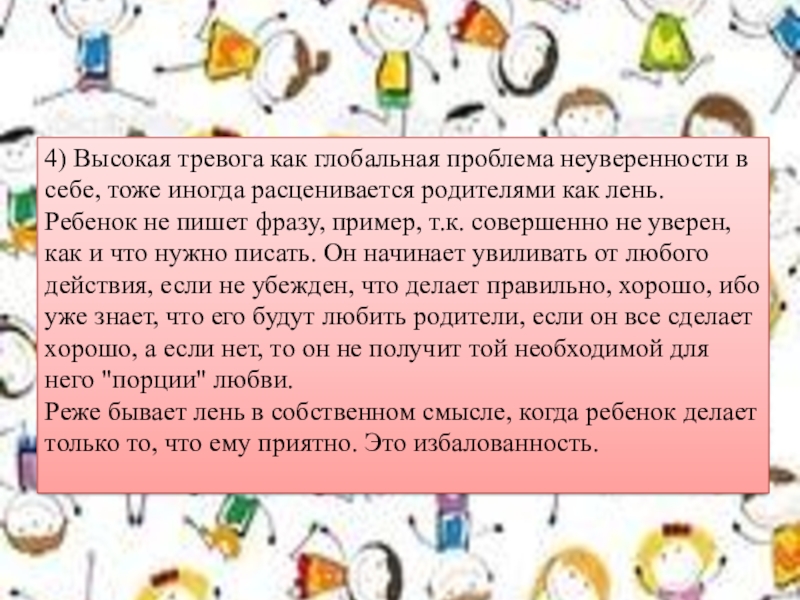 2) мотивация избегания неудач, неуспеха ("и не буду делать, у меня не получится, я не умею"), то есть ребенок отказывается что-либо делать, так как не уверен в успехе и знает, что за плохую оценку, работу его не похвалят, а лишний раз обвинят в некомпетентности. 3) общая замедленность темпа деятельности, связанная с особенностями темперамента. Ребенок трудится добросовестно, но медленно, и родителям кажется, что ему "ЛЕНЬ ШЕВЕЛИТЬСЯ", они начинают его подгонять, раздражаются, проявляют недовольство, а ребенок в это время чувствует, что он не нужен, что он плохой. Возникает ТРЕВОГА.