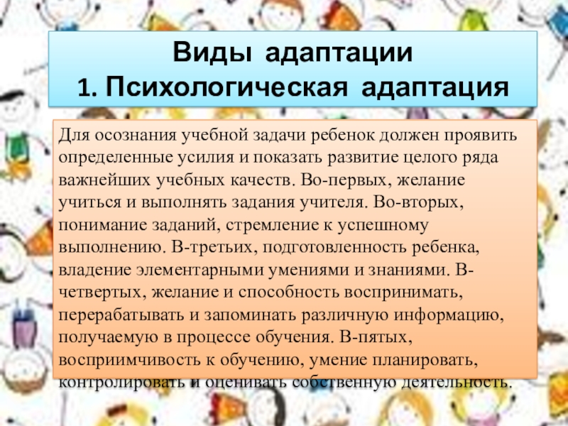 определенные усилия и показать развитие целого ряда важнейших учебных качеств. Во-первых, желание учиться и выполнять задания учителя. Во-вторых, понимание заданий, стремление к успешному выполнению. В-третьих, подготовленность ребенка, владение элементарными умениями и знаниями. В-четвертых, желание и способность воспринимать, перерабатывать и запоминать различную информацию, получаемую в процессе обучения. В-пятых, восприимчивость к обучению, умение планировать, контролировать и оценивать собственную деятельность.