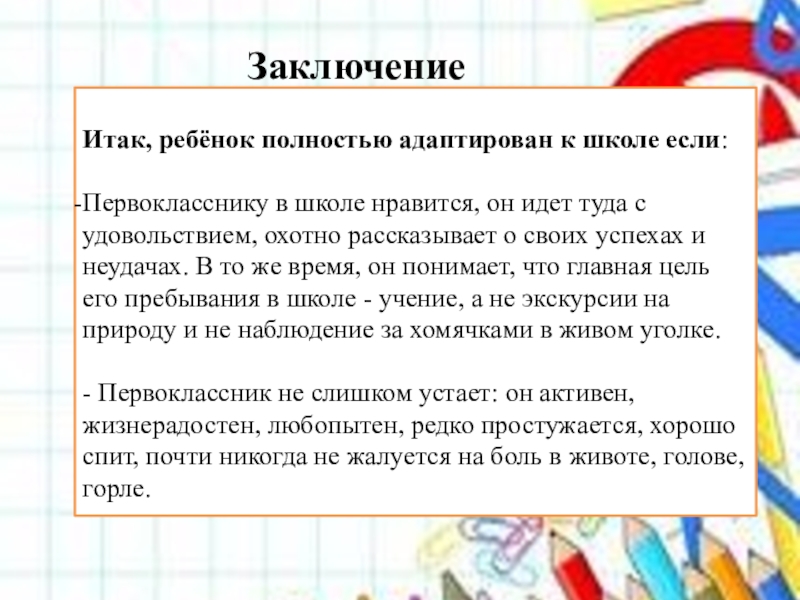 - Первоклассник не слишком устает: он активен, жизнерадостен, любопытен, редко простужается, хорошо спит, почти никогда не жалуется на боль в животе, голове, горле.