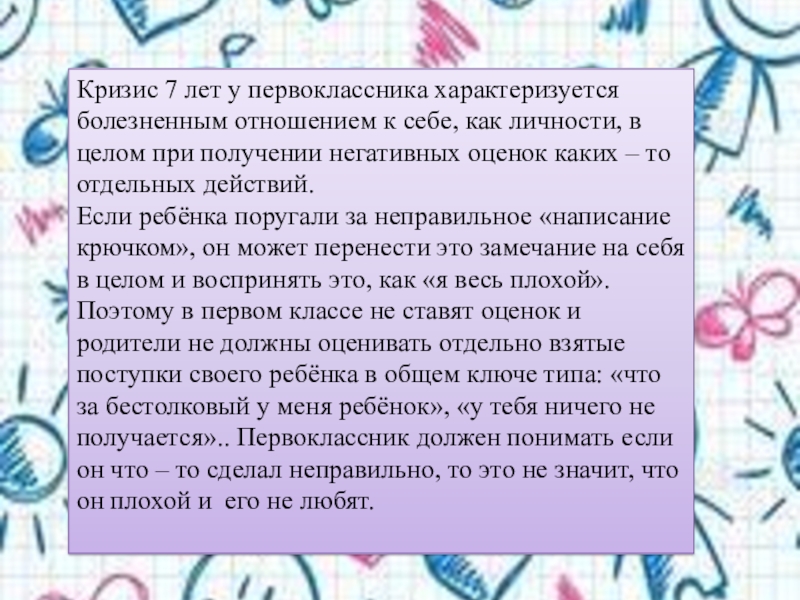 Слайд 11Кризис 7 лет у первоклассника характеризуется болезненным отношением к себе, как