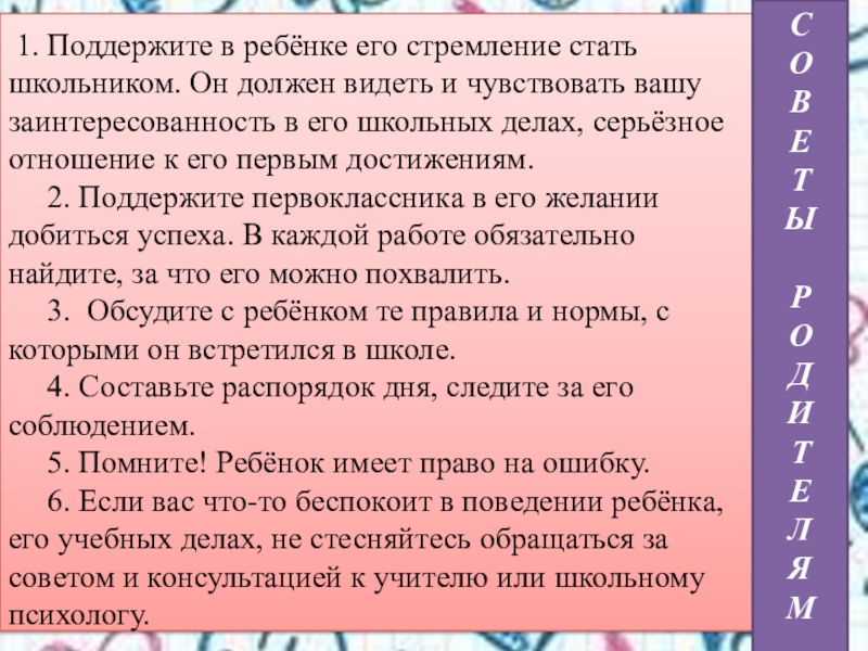 6. Если вас что-то беспокоит в поведении ребёнка, его учебных делах, не стесняйтесь обращаться за советом и консультацией к учителю или школьному психологу.