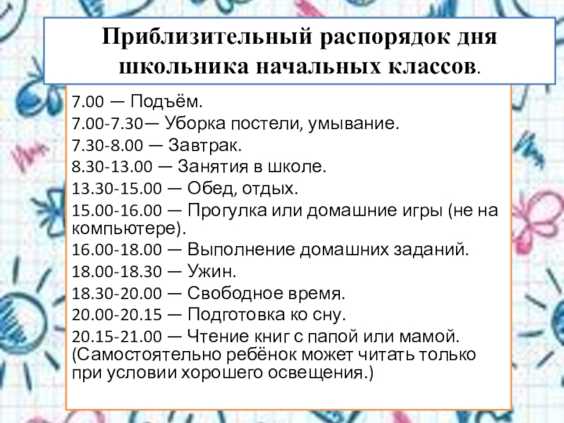 20.15-21.00 — Чтение книг с папой или мамой. (Самостоятельно ребёнок может читать только при условии хорошего освещения.)