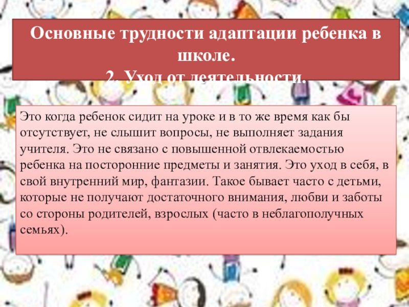 сидит на уроке и в то же время как бы отсутствует, не слышит вопросы, не выполняет задания учителя. Это не связано с повышенной отвлекаемостью ребенка на посторонние предметы и занятия. Это уход в себя, в свой внутренний мир, фантазии. Такое бывает часто с детьми, которые не получают достаточного внимания, любви и заботы со стороны родителей, взрослых (часто в неблагополучных семьях).