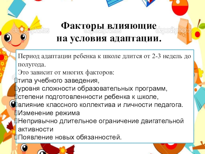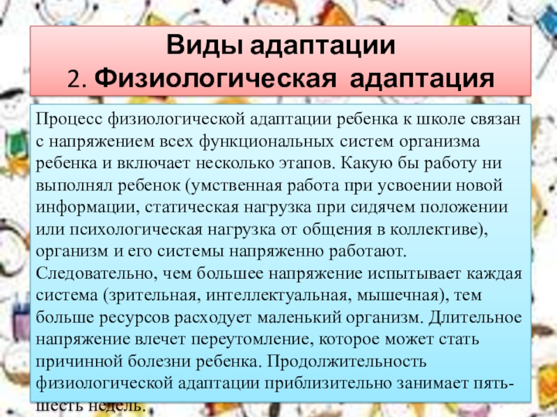 с напряжением всех функциональных систем организма ребенка и включает несколько этапов. Какую бы работу ни выполнял ребенок (умственная работа при усвоении новой информации, статическая нагрузка при сидячем положении или психологическая нагрузка от общения в коллективе), организм и его системы напряженно работают. Следовательно, чем большее напряжение испытывает каждая система (зрительная, интеллектуальная, мышечная), тем больше ресурсов расходует маленький организм. Длительное напряжение влечет переутомление, которое может стать причинной болезни ребенка. Продолжительность физиологической адаптации приблизительно занимает пять-шесть недель.