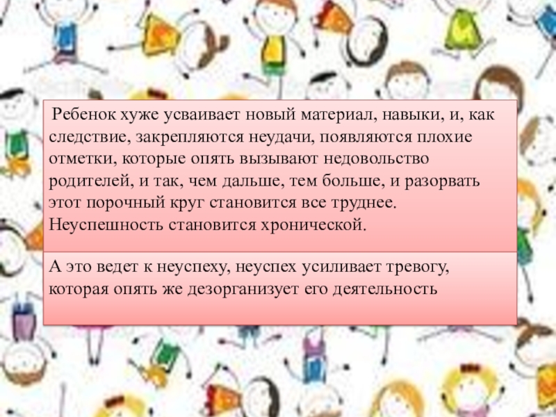 неудачи, появляются плохие отметки, которые опять вызывают недовольство родителей, и так, чем дальше, тем больше, и разорвать этот порочный круг становится все труднее. Неуспешность становится хронической.