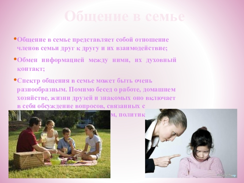 Спектр общения в семье может быть очень разнообразным. Помимо бесед о работе, домашнем хозяйстве, жизни друзей и знакомых оно включает в себя обсуждение вопросов, связанных с воспитанием детей, искусством, политикой и т.д.