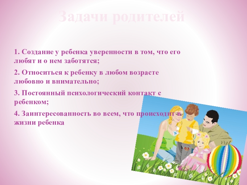 Задачи родителей 1. Создание у ребенка уверенности в том, что его любят и о нем заботятся;2. Относиться