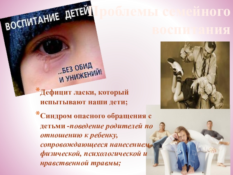 Проблемы семейного воспитанияДефицит ласки, который испытывают наши дети;Синдром опасного обращения с детьми -поведение родителей по отношению к