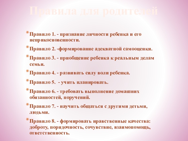 Правила для родителей Правило 1. - признание личности ребенка и его неприкосновенности. Правило 2. -формирование адекватной самооценки.