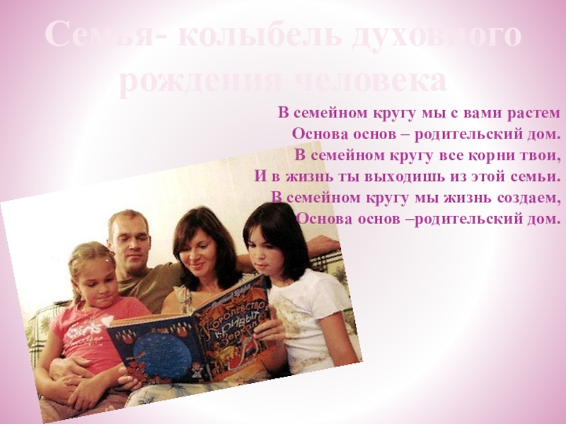 Семья- колыбель духовного рождения человекаВ семейном кругу мы с вами растемОснова основ – родительский дом.В семейном кругу