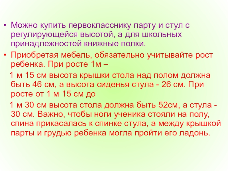 Приобретая мебель, обязательно учитывайте рост ребенка. При росте 1м –