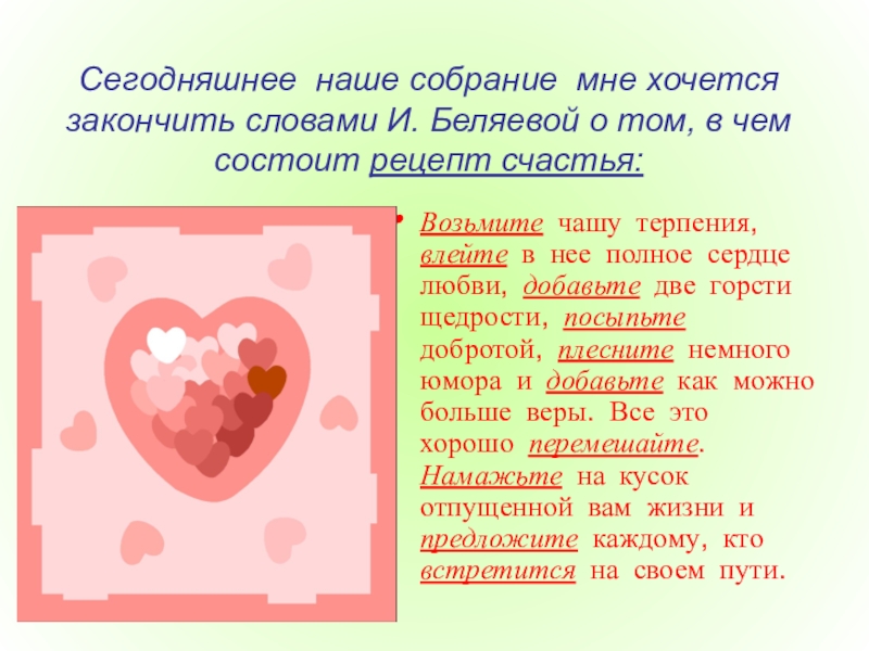Слайд 39Сегодняшнее наше собрание мне хочется закончить словами И. Беляевой о том,