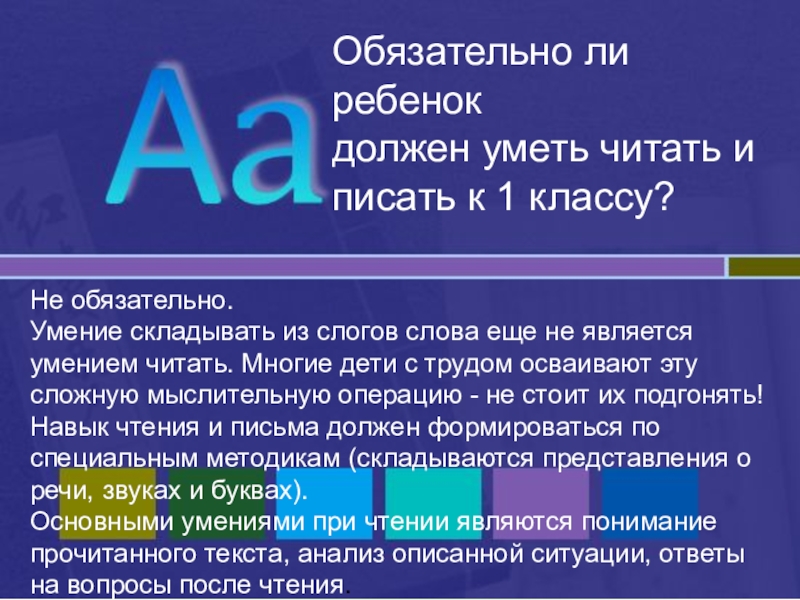 Умение складывать из слогов слова еще не является умением читать. Многие дети с трудом осваивают эту сложную мыслительную операцию - не стоит их подгонять! Навык чтения и письма должен формироваться по специальным методикам (складываются представления о речи, звуках и буквах).