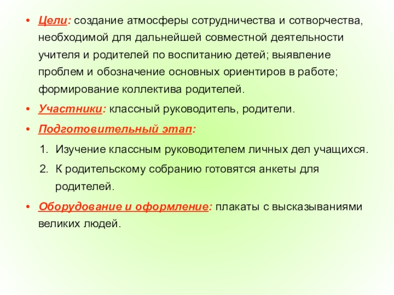 учителя и родителей по воспитанию детей; выявление проблем и обозначение основных ориентиров в работе; формирование коллектива родителей.
