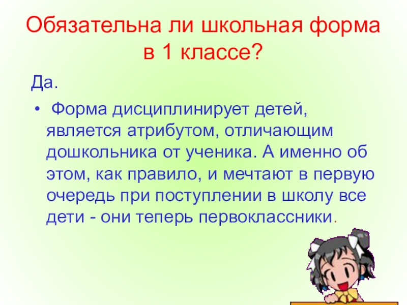 Слайд 12Обязательна ли школьная форма в 1 классе?