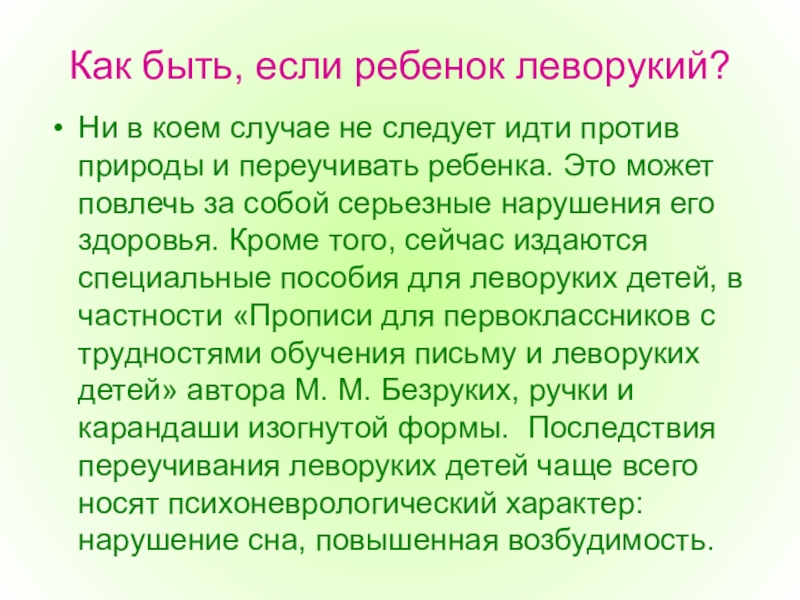 против природы и переучивать ребенка. Это может повлечь за собой серьезные нарушения его здоровья. Кроме того, сейчас издаются специальные пособия для леворуких детей, в частности «Прописи для первоклассников с трудностями обучения письму и леворуких детей» автора М. М. Безруких, ручки и карандаши изогнутой формы. Последствия переучивания леворуких детей чаще всего носят психоневрологический характер: нарушение сна, повышенная возбудимость.